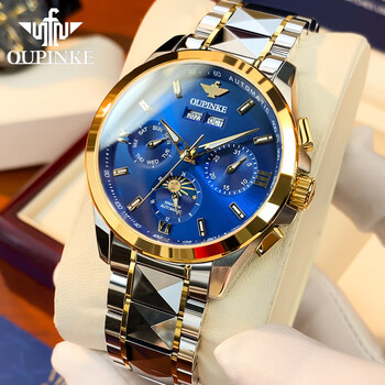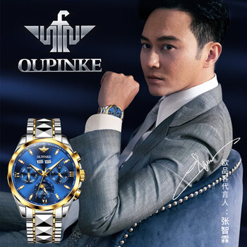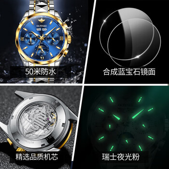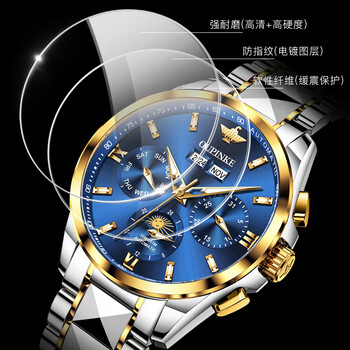 欧品客手表男机械表生日礼物月相日历夜光防水国表瑞士认证品牌男士手表