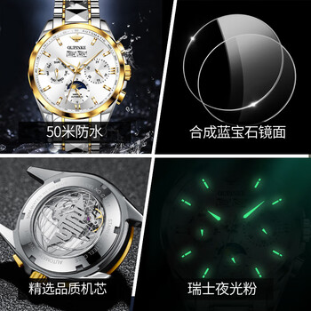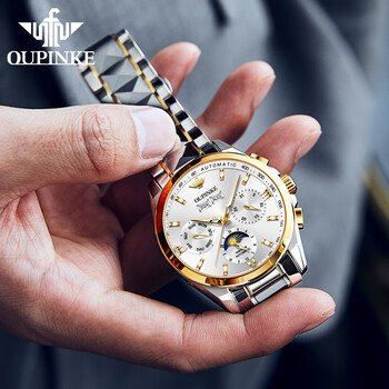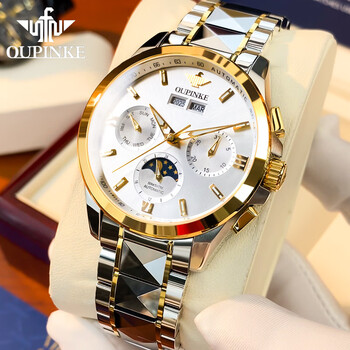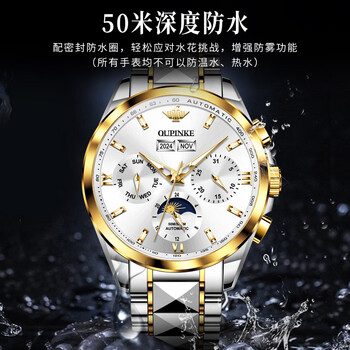 欧品客瑞士认证品牌手表男机械表多功能日历月相夜光防水男手表生日礼物