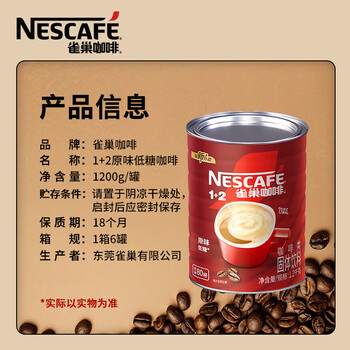 雀巢(Nestle)1+2原味速溶咖啡粉1.2kg/桶 三合一低糖罐装量贩装 可冲80杯