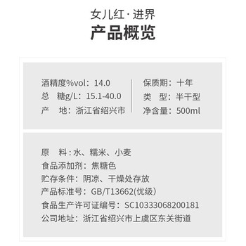 女兒红 进界 半干型 绍兴黄酒 500ml 单瓶装