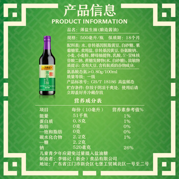 李锦记 薄盐系列 薄盐生抽500ml【减盐 一级】健康更安心 酱油