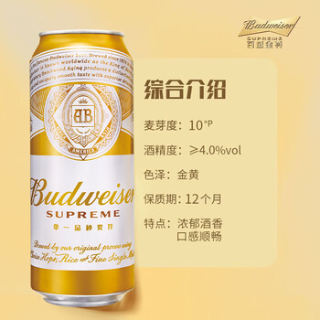 百威(Budweiser)金尊啤酒 Supreme 单一品种麦芽啤酒 500ml*18听 整箱装