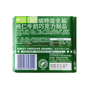 瑞特滋(RITTER SPORT)全扁桃仁牛奶巧克力 100g 休闲零食糖果节日礼物送男女友德国原产