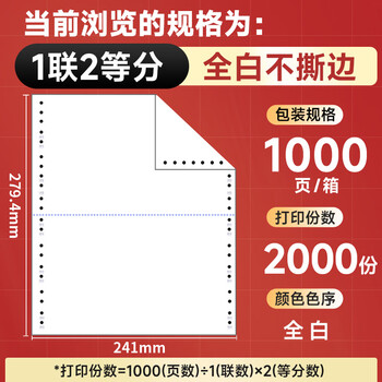 天章 (TANGO)【缺页十倍赔】天章风一联二等分不撕边 针式电脑打印纸 出入库送货清单 1000页 241-1-1/2(全白)