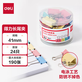 得力(deli)24只41mm彩色长尾夹票夹 2#大号金属燕尾夹票据文件夹子 办公用品 24只/筒 8552