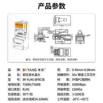 博扬超五类RJ45水晶头 Cat5e类千兆网线水晶头 工程级非屏蔽连接头(50U镀金)100/盒 BY-RJ45-8P8C5E*1 合格证*1 保修卡*1