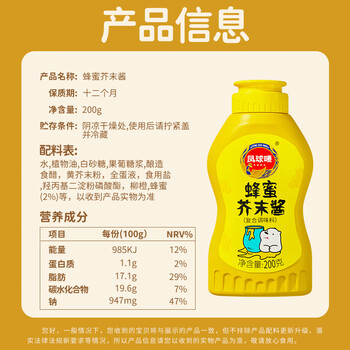 凤球唛蜂蜜芥末酱200g沙拉酱黄芥末甜辣酱韩式炸鸡汉堡三明治披萨蘸酱汁