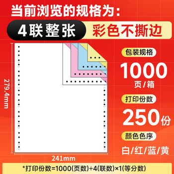 天章 (TANGO)【缺页十倍赔】天章龙 四联整张针式打印纸 不撕边电脑打印纸 出库送货单1000页 241-4(白红蓝黄)
