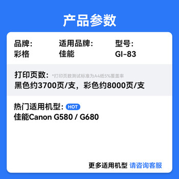 彩格GI-83墨水6色套装适用佳能Canon G580 G680照片打印机墨水墨盒 6色加墨式照片一体机 彩色喷墨打印机墨仓墨水