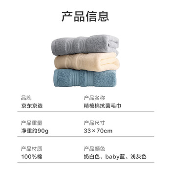 居家布艺---毛巾/浴巾/浴袍---毛巾京东京造京东京造精梳棉抗菌毛巾 3条装(奶白色+浅灰+baby蓝色)