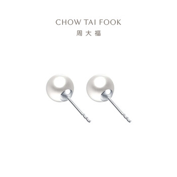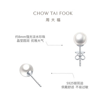周大福简约时尚 925银镶珍珠耳钉 AQ33137 直径约8-8.5mm礼物