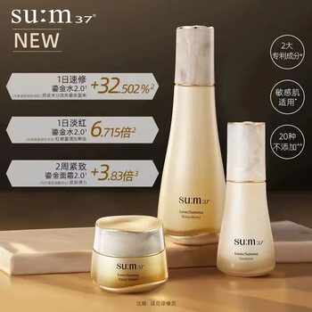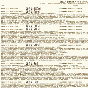 苏秘37°鎏金水150ml*1+20ml*1、苏秘37°鎏金乳60ml*1+20ml*1、苏秘37°鎏金面霜20ml*1、苏秘37°眼霜6ml*1、苏秘37°多效精华液8ml*1、苏秘37°鎏金洁面啫喱90ml*1