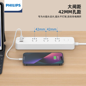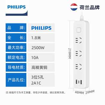 飞利浦(PHILIPS)USB插座 3位总控1.8米 插排/插线板/排插/接线板/拖线板/3USB接口多功能插板