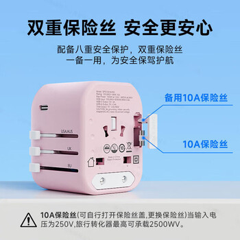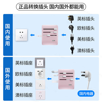 飞利浦(PHILIPS)出国转换插头/多国通用旅行插座转换器/英欧美澳标德国日本新加坡香港适用/2A1C充电 17W粉