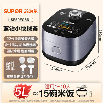 苏泊尔(SUPOR)电饭煲4-5人大容量5升蓝钻小快球釜内胆家用不粘柴火饭多功能微压智能电饭锅SF50FC661