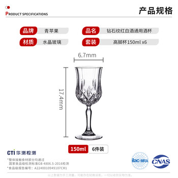 青苹果水晶玻璃红酒杯白酒杯150ml*6只 高脚杯香槟杯洋酒杯