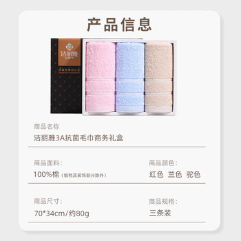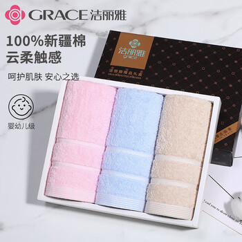 洁丽雅 毛巾礼盒3条装A类商务纯棉洗脸巾 公司员工福利 礼盒可绣字定制