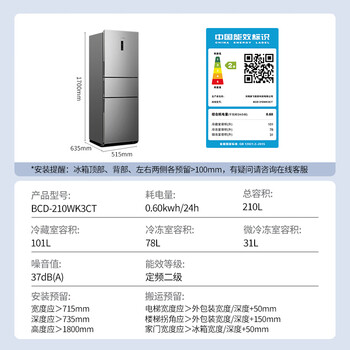 | 容积 | 总容积210L;冷藏101L;冷冻78L |