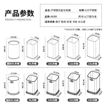 AKBK不锈钢垃圾桶9L银色家用客厅厨房卫生间轻奢酒店办公室大号方形