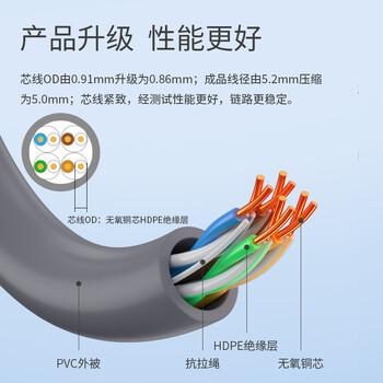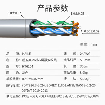 HAILE海乐超五类网线HT6104灰CAT5E无氧铜0.5线芯非屏蔽支持POE供电灰色 305米