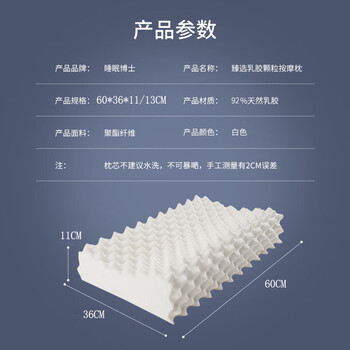 规格:58*37*11/13cm 外枕套:80%棉 20%聚酯纤维 内枕套:100%聚酯纤维 枕芯含量:85%乳胶 15%发泡助剂