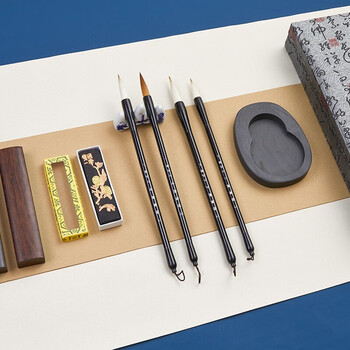 毛笔*4支、端砚*1方、镇尺*1对、 墨条*1根、陶瓷笔搁*1个、陶瓷墨碗*1个、 棋盘控笔书写布*1、米字格水写布*1、笔画水写布*1、 7*15毛边纸30张、50*50毛毡、速成视频字帖*1、 书法基础练习字帖*1、视频教程*1、包装礼袋*1