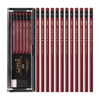 uni三菱 金装铅笔H 原木杆铅笔书写绘画素描设计 12支/盒(含橡皮)1887