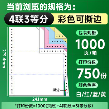 新绿天章四联三等分可撕边针式电脑打印纸 1000页241-4-1/3S 彩色(白红蓝黄)