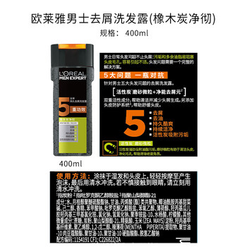 欧莱雅男士去屑洗发水(橡木炭净彻洗发露)400ml