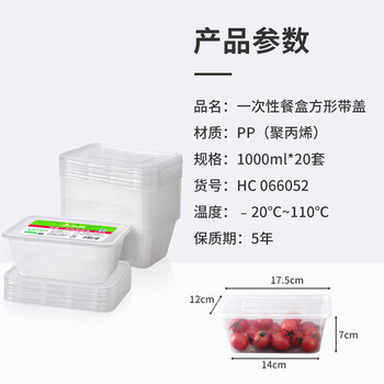美丽雅 一次性饭盒方形1000ml*20套 外卖打包野餐盒加厚带盖塑料可微波
