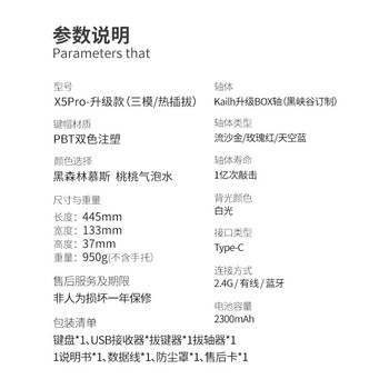 键盘*1 说明书*1 质保卡*1 防尘面罩*1 拔键器*1 拔轴器*1 手托*1 接收器*1 数据线*1