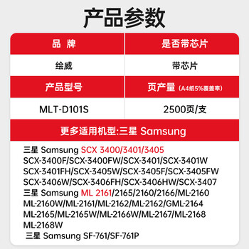 绘威MLT-D101S硒鼓 适用三星SCX-3401 3400 3405 3406粉盒ML-2161 2162 2164 2165打印机硒鼓 易加粉 中文版