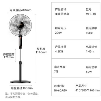 美菱(MeiLing)电风扇/落地扇 七叶家用四档加强风扇落地/交流定频风扇可拆卸轻音定时摇头电扇 MFS-40黑色款