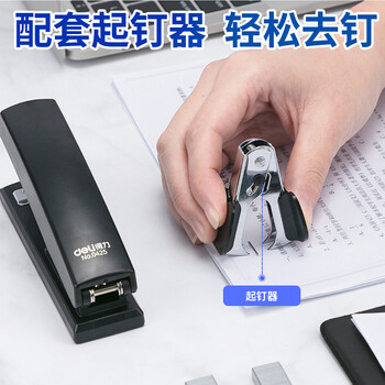 得力(deli)订书机套装0354黑色12号钉厚书长臂省力订书机学生用订书器包含起订器订书针订书机