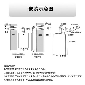 热水器本体×1 尼龙膨胀管×2 木螺钉×2 膨胀螺栓×1 安装螺钉×3 进出水口档板×1 说明书×1 直角弯管×1 排烟直管×1 铝箔×2