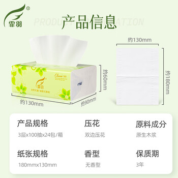 品名:霏羽24包抽纸 成分:原生木浆 规格:130mm*180mm/节 层数:3层 包装:100抽(300张)/包 是否含香:无香 装箱数:24包链接