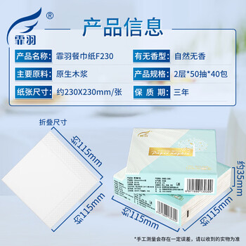 品名:霏羽50片40包商务方巾纸 型号:F230 单张规格:230*230mm/张 层数:双层 数量:50片/包 整箱40包
