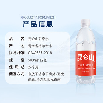 昆仑山矿泉水 饮用天然弱碱性 500ml*12瓶 整箱装 高端矿泉水