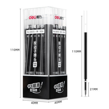 得力(deli)0.5按动中性笔替芯 学生水笔签字笔芯 S01/S08/1008/K35适用同G-5 子弹头黑色50支/盒 33572