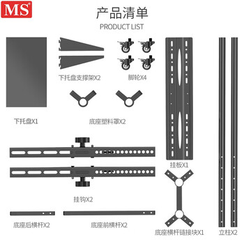 挂架面板*1 推车侧立柱*2 底座塑料罩*2 下托盘*1 下托盘支撑架*2 脚轮*4 电视挂钩*2 底座后横杆*2 底座前横杆*2 底座横杆连接块*1 使用说明*1 配件螺丝包*1