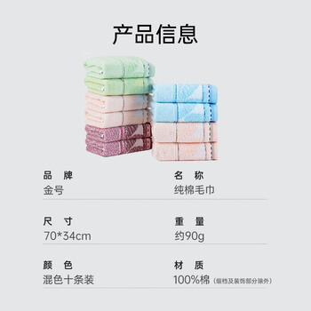 金号毛巾家纺 A类新疆纯棉吸水洁面巾 全棉洗脸毛巾 混色10条装