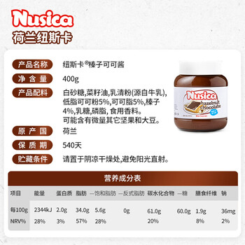 纽斯卡荷兰进口榛子可可酱巧克力酱400g早餐伴侣面包