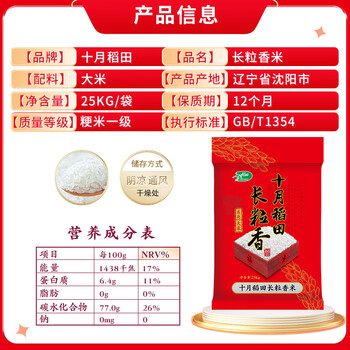 十月稻田 当季新米 长粒香大米 50斤(东北大米家庭装 香米 五十斤)