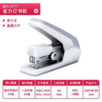 品牌:得力(deli) 颜色:白色 尺寸:140mm*44mm*69mm 订纸厚度:2-20pages/80g 书钉种类:24/6&26/6