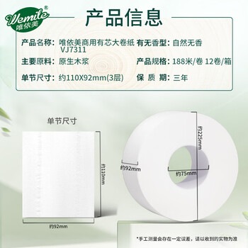 唯依美大卷纸有芯3层188米*12卷商用大盘纸卫生纸商场厕纸 整箱VJ7311