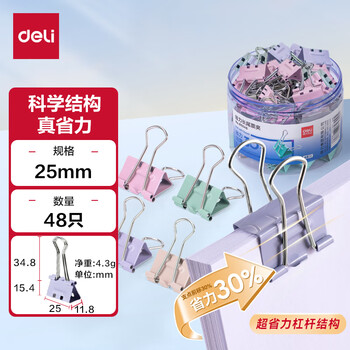得力(deli)【超级爆款】48只25mm省力彩色长尾夹票夹 中号金属燕尾夹票据文件夹 48只/筒 8554S