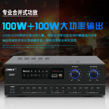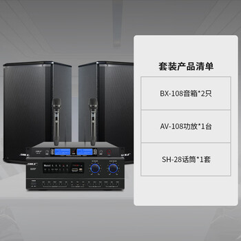 狮乐AV-108功放×1、BX-108黑×2、音箱线12米×1、遥控器×1、说明书×1、保修卡×1、话筒主机×1、手持麦克风×2、一分二莲花线× 1、二分二莲花线× 1、