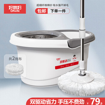 好媳妇旋转拖把38cm2个棉头 液压杆双驱动免手洗家用一拖净不锈钢篮