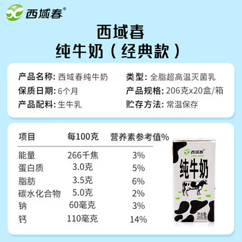 西域春 新疆纯牛奶早餐奶整箱206g*20盒 新疆特产儿童营养早餐奶