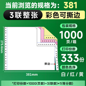 天章 (TANGO)【缺页十倍赔】新绿天章三联整张针式打印纸 撕边电脑打印纸 出入库送货单(381-3S 白红黄 1000页)